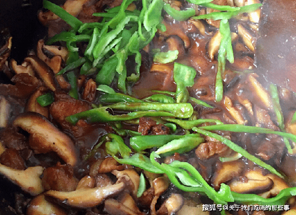 3、倒入香菇片,大火翻炒2分鐘,香菇變軟後加入食鹽、生抽、蠔油、白糖調味,翻炒均勻後倒入青椒絲,翻炒至斷生後即可出鍋。
