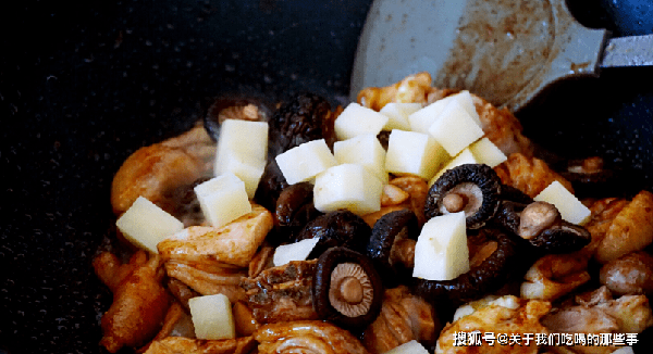 3、放入蔥薑炒香,淋入料酒翻炒去腥,再放入生抽、老抽翻炒上色,加入土豆塊、香菇翻炒均勻,加入開水沒過食材,放幾顆冰糖,小火燉20分鐘。