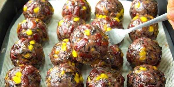 2、準備30克葡萄幹,30克紅棗清洗幹凈。把紅棗剪成小塊,和葡萄幹剁碎,放入碗中,再加50克玉米,蒸熟的紅豆、花生、黑米、糯米,30克白糖,用筷子攪拌均勻後,再加入100克糯米粉。繼續用筷子攪拌均勻,用手捏一團搓成小圓球,一個生胚就做好瞭。