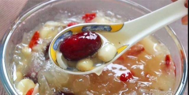2、砂鍋裡面加入一些涼水,倒入銀耳,百合、蓮子,蓋上蓋子,開小火熬上15分鐘,湯汁已經變得很濃稠,再把梨、枸杞、小棗倒進來,適量的冰糖攪拌均勻,再用小火燉上十分鐘左右即可。