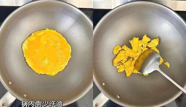 2:鍋裡提前燒熱,多放一些植物油,滑入雞蛋液煎熟,讓蛋液快速凝固成型,用鍋鏟迅速翻炒均勻,裝在容器備用。