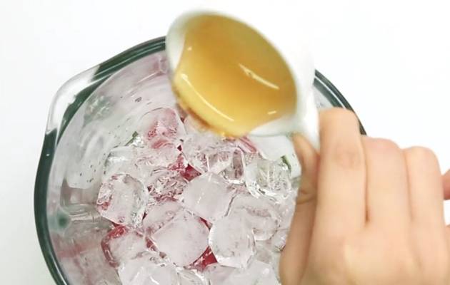 第二步:隨後準備一個破壁機,依次加入黃瓜塊,覆盆子,冰塊,蜂蜜,薄荷葉,然後用中速打制成細碎的冰沙。