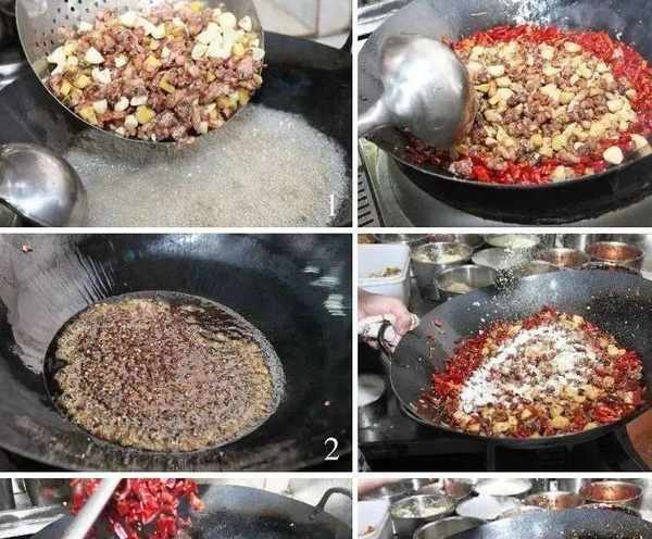 3.鍋留底油,分別投入幹青花椒和幹辣椒節熗香,接著倒入炸好的兔丁並轉小火翻炒,其間加入鹽、味精、雞精和自制粗香料粉(用八角、山柰、茴香等香料制成),起鍋前加入少許的十三香,裝盤後撒入熟芝麻和蔥花便可上桌(見圖2~7)。
