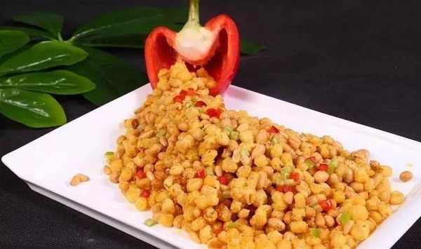 此菜由“咸蛋黃焗南瓜”、“松仁玉米”兩道甜菜融合改良而來,將鮮玉米粒拍粉炸酥,焗上一層咸蛋黃,再撒酥黃豆、松仁,成菜既有玉米粒的鮮甜,又有蛋黃、松仁、黃豆的濃香,口味富有層次,大受女士、兒童的歡迎。