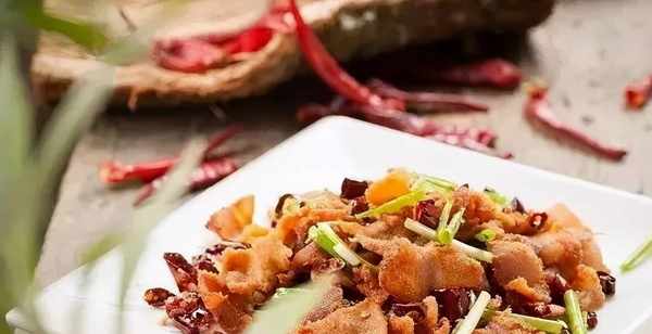 2、炒鍋置旺火上入少許油燒熱,入五花肉片炒至出油,繼續炸至瘦肉發硬呈油渣狀,撈出瀝油;