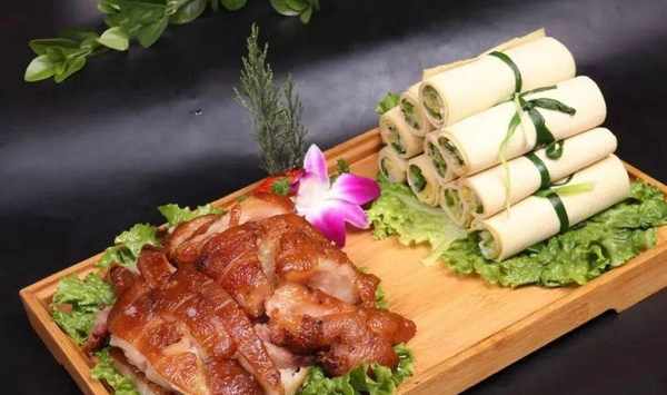 豆皮卷入香蔥、黃瓜、雞蛋絲等,搭配先鹵後炸的豬肘子一同食用,不僅清爽解膩,而且使賣相更加靚麗。