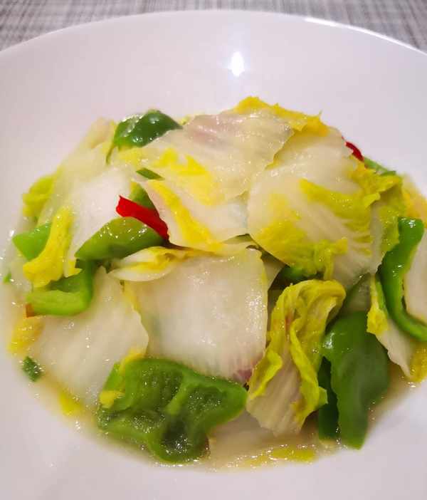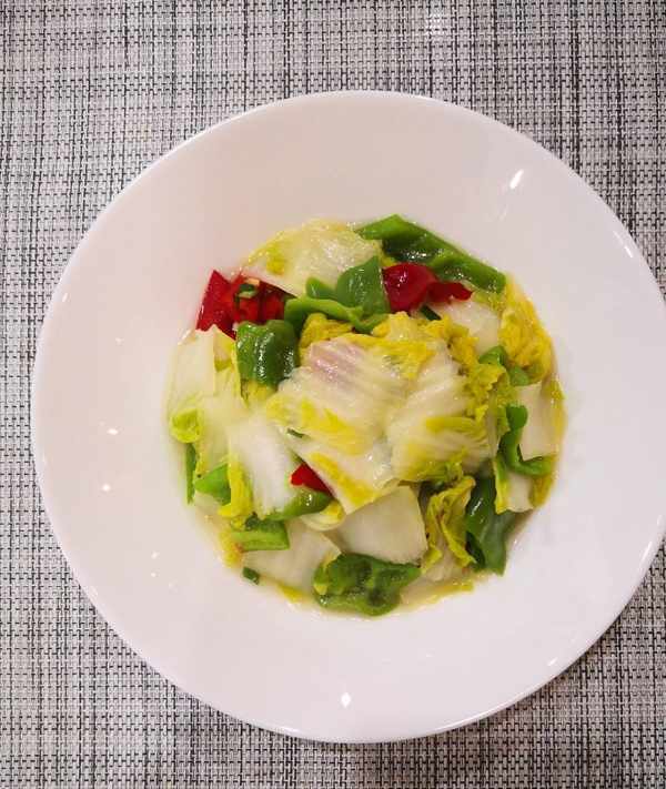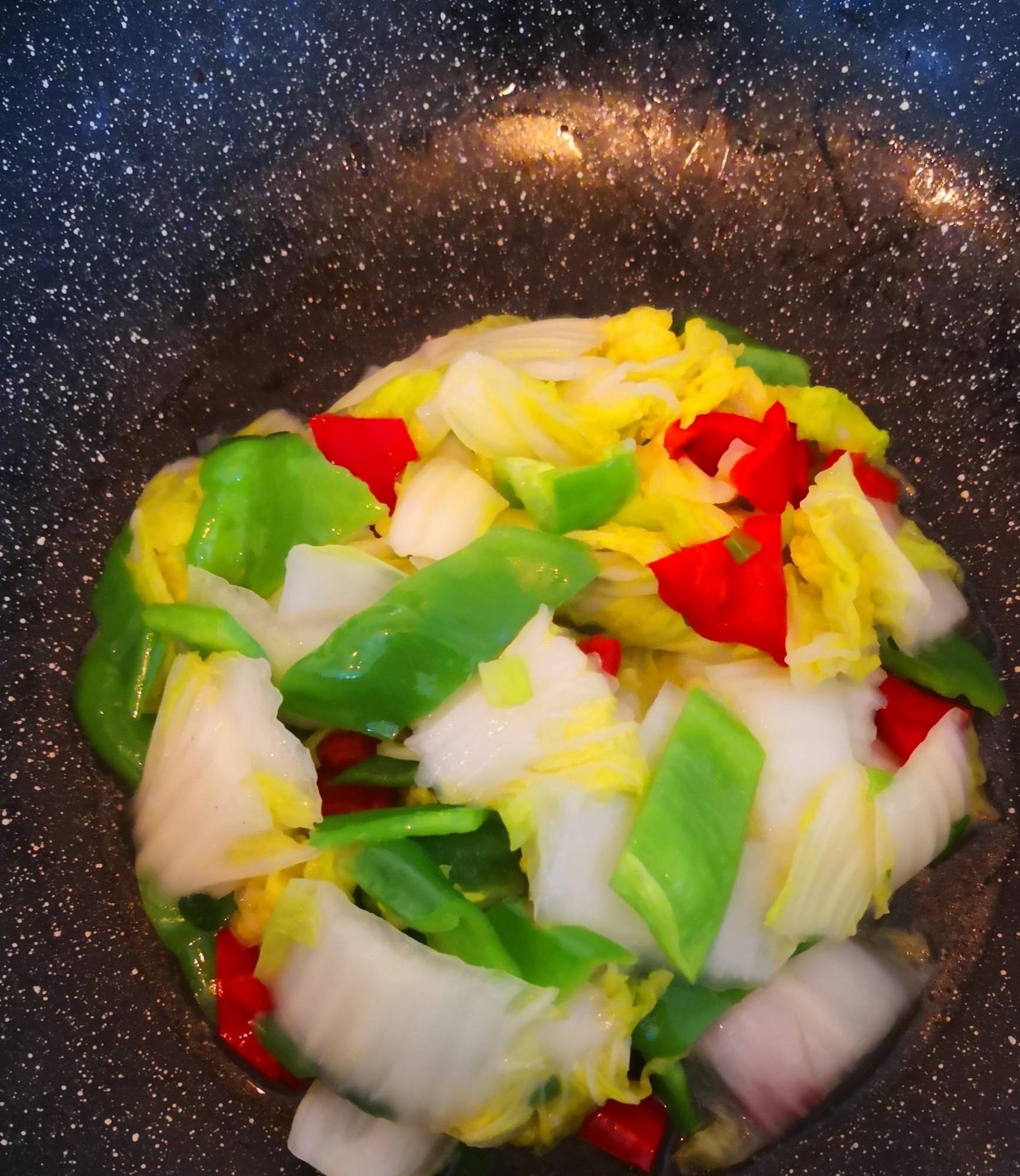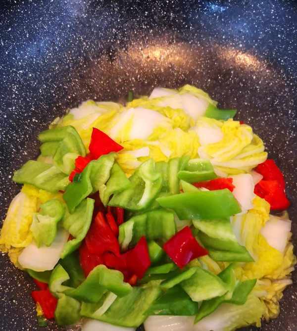 油熱後倒入蔥花炒出香味,倒入娃娃菜翻炒至變軟,倒入青紅椒。