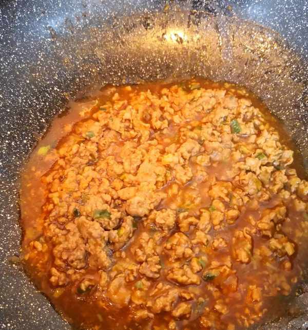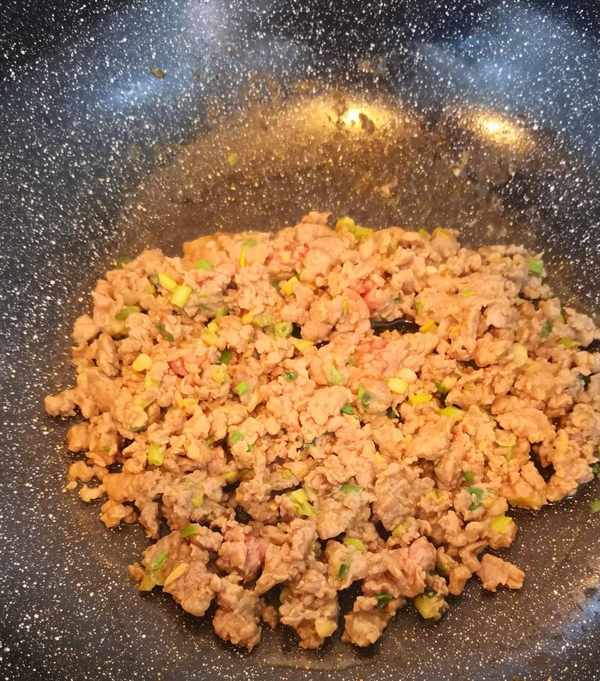 熱鍋涼油,倒入蔥花炒出香味,倒入醃制好的肉餡翻炒至變色。