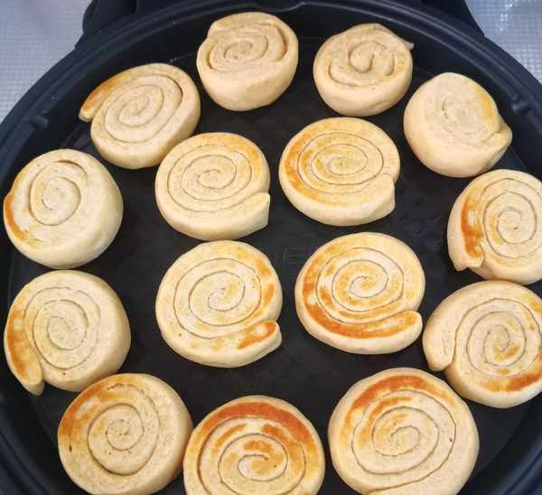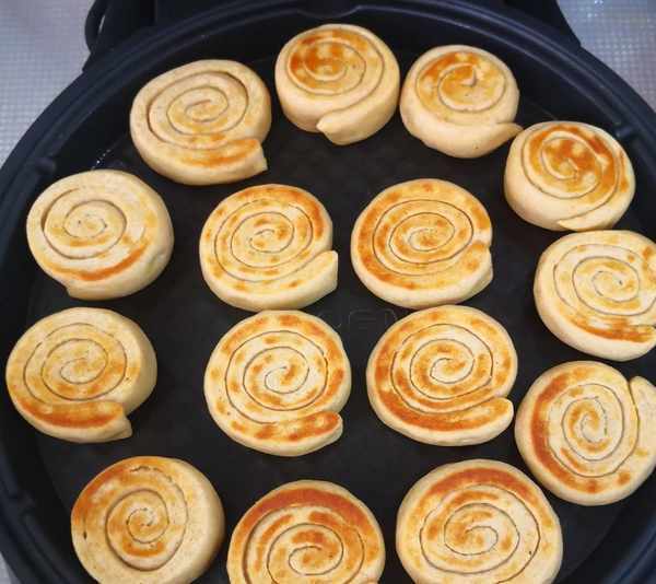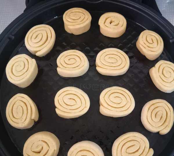 電餅鐺刷薄油,放入生胚,註意每個生胚之間要留點空隙,防止加熱的過程中餅變大,粘黏到一起。