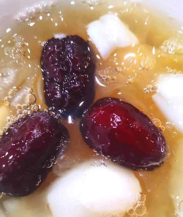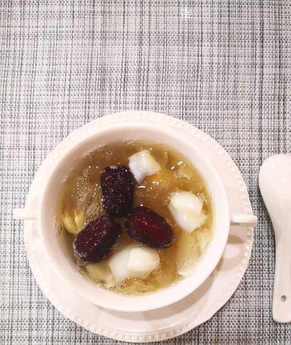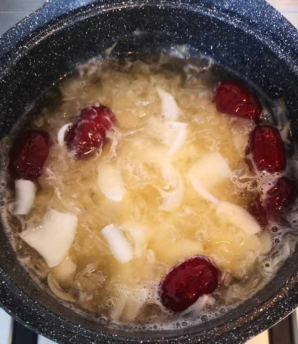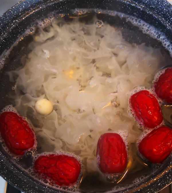 水開後倒入銀耳、蓮子、紅棗再次煮開後調中小火繼續煮。