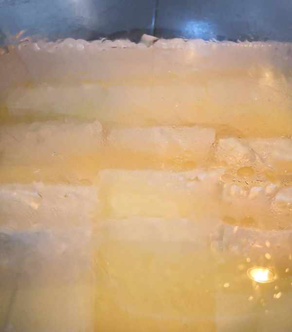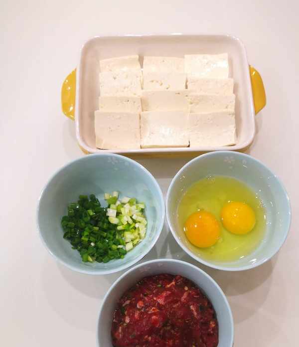 豆腐切塊碼入盤子裡,蔥切小圈,打兩個雞蛋備用。