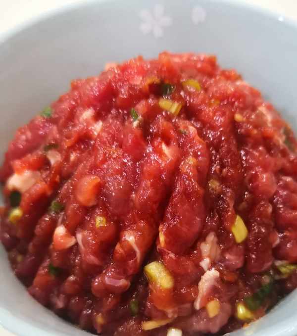 肉餡裡加蔥、薑、鹽、生抽、老抽拌均勻後少量多次的加水攪打肉餡至肉上勁,醃制20分鐘。