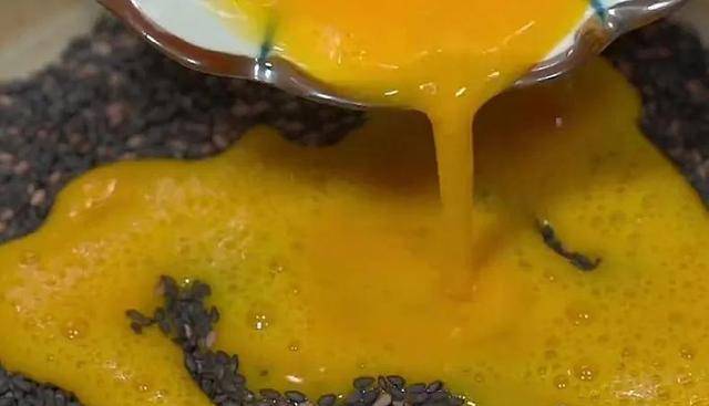 3.準備兩個雞蛋,將雞蛋表面洗凈,打入碗裡面攪拌均勻。接著把雞蛋液倒在炒好後的芝麻上面,用筷子將食材充分地攪拌均勻;