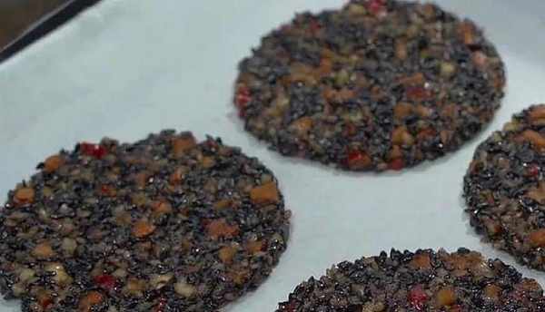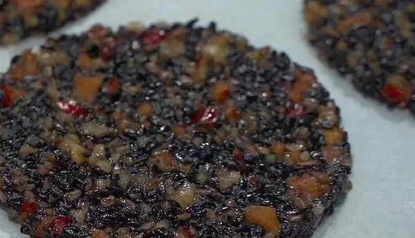 8.攪拌成下圖這一種粘稠的狀態,攪拌好後的食材放到一旁。準備一個模具,然後我們將食材放在模具裡面,用手給它壓平,壓成扁扁的小圓餅;