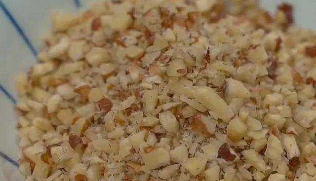 5.不過,還有一些核桃,需要用工具將核桃的殼給它處理掉,剝開皮取出肉。處理好後核桃放在案板上用刀給它剁成細核桃碎或者是用攪碎機處理一下。處理好的核桃放在碗中備用;