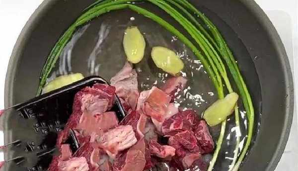 2.準備一個鍋將生薑還有小蔥放入鍋裡面,再把牛腩倒入裡面,加入適量的水,將鍋中的食材煮開。水開後就可以將牛腩撈出,再用清水洗凈,洗凈放在一旁;