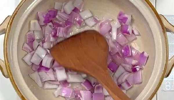 3.洋蔥洗幹凈,洗凈後的洋蔥切成丁切好放一旁。鍋中倒入油,洋蔥丁放入油鍋中小火炒一下,炒出香味;