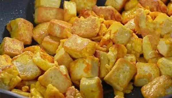 2.鍋裡面預熱,將鍋中的水分燒幹後倒入適量的油,油熱瞭之後我們再把備好的豆腐放入油鍋,用小火炒一下,鍋中的食材煎至兩面微微焦黃,然後把煎熬後的豆腐盛出放在碗裡面;