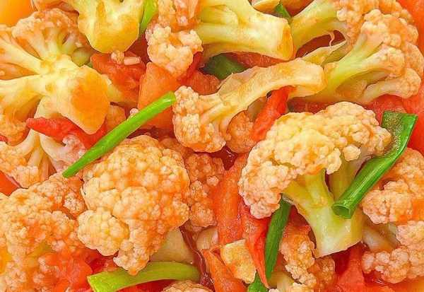 1、番茄用食鹽搓洗幹凈,洗凈後切成小塊。花菜剪成小朵放入清水中,加入食鹽攪勻浸泡十分鐘,再清洗幹凈瀝幹水分。