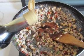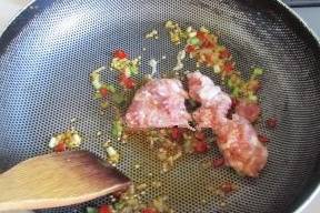 5、肉末翻炒變色後加入香菇末一起翻炒,再加入點適量鹽和醬油,調味;