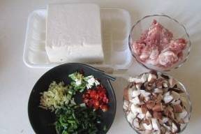 制作食材:豆腐、香菇、肉沫。輔料:小蔥、幹辣椒、醬油、薑沫、淀粉。