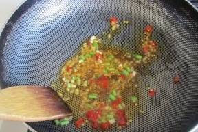 3、燒熱鍋,放入油,油八成熱後下入薑末、紅椒末和蔥白一起煸炒;