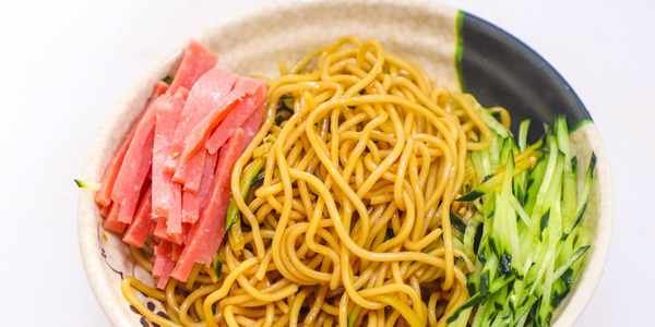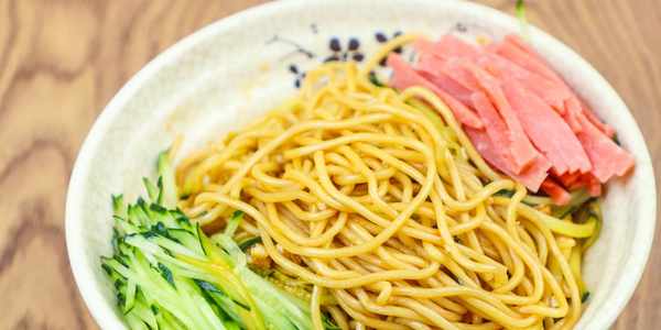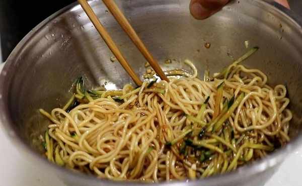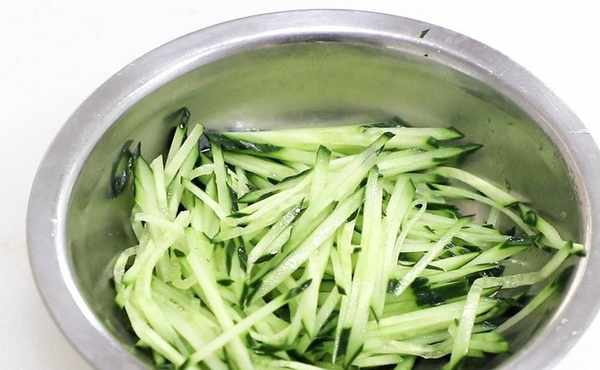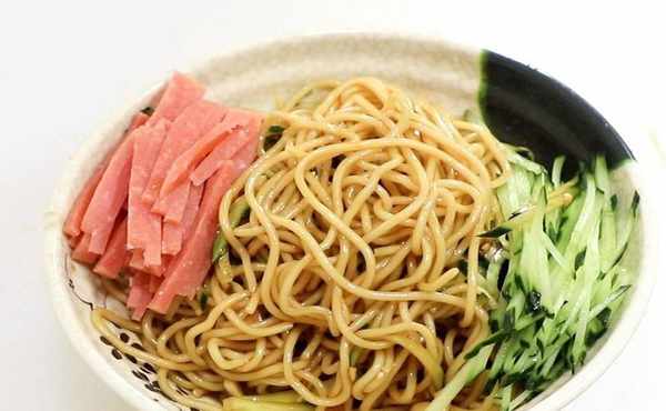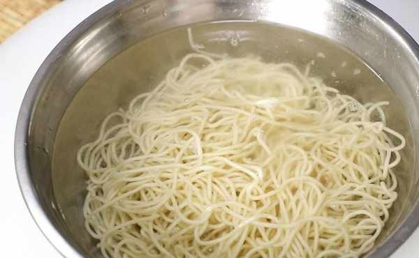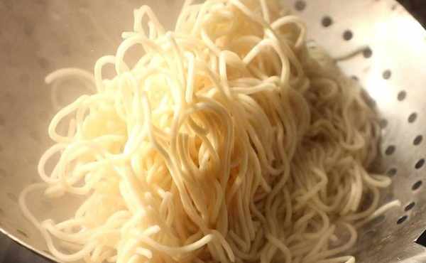 放入涼開水中過涼,這一步的目的是保留面條筋道的口感,面條冷卻以後倒出控水備用。