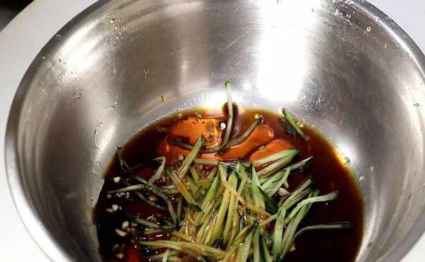 準備一個大點的盆,倒入切好的蒜末、黃瓜絲,加入食鹽2克,白糖少許提鮮,味精1克,生抽10克,陳醋10克,芝麻香油5克,辣椒紅油10克。