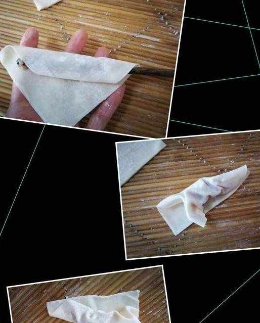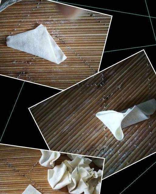 接下來準備包餛飩,這一步很關鍵。買餛飩皮的時候盡量挑選薄一些的,將皮裡放一點餡料(順手用筷子上的濕度抹在餛飩皮的四周,這樣更容易包)第一步先兩個對角對折,然後再將剩下的兩個角折上就可以瞭,也可以瞭用食指和拇指同時握一下也行,不要太用力捏太緊就行,因為餛飩煮的時間短,不用擔心它的餡會跑出來。如果捏的太緊的話,它的皮吃起來還會有粘牙感的。就像我配圖的樣子就可以瞭。