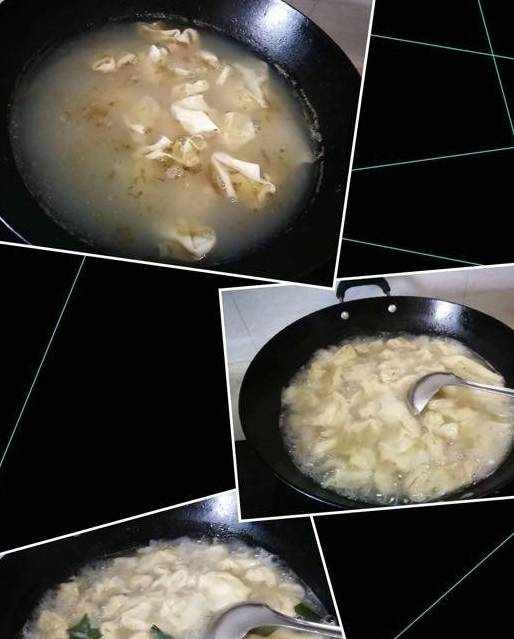一切準備就緒,可以下餛飩瞭,先把泡好的海菜擱進去,水開後下餛飩,餛飩不要一個一個跟下餃子一樣下,要同時下進去,不然熟的不均勻。餛飩皮薄不能煮的太久,鍋開一會兒餛飩飄起來就可以瞭,不然也會影響口感。