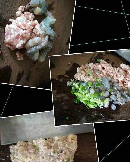 順變將做餛飩的過程也分享出來吧,先說調餡兒,我喜歡用蝦仁加五花肉末,這樣的餡吃起來比較鮮嫩。你也可以蝦仁的量大一些。先將蝦仁和肉餡放一起剁成泥,也可以加些蔥一起剁。加工完放碗裡備用。