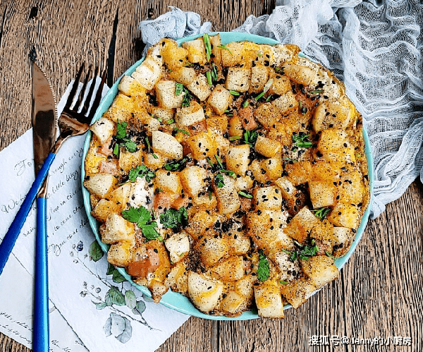 接著淋入蛋液,保持小火煎,再撒些黑芝麻、香菜或者蔥花,煎到蛋液凝固,這道美味早餐就做好瞭。
