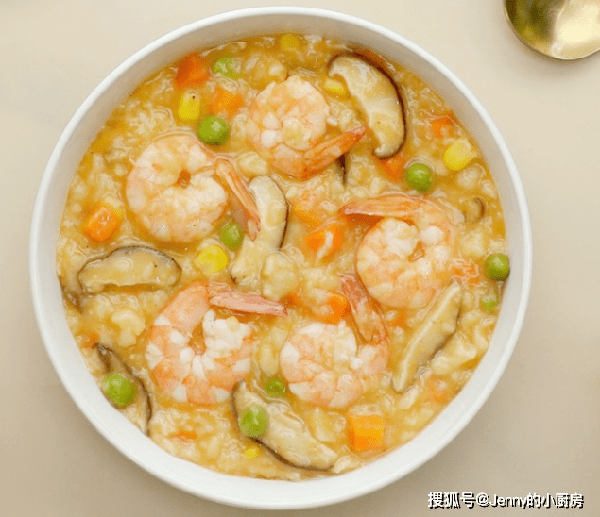 大蝦去掉蝦頭,取出蝦仁,去掉蝦線,蝦頭、蝦仁分別洗凈。豌豆、玉米粒、胡蘿卜丁、香菇片準備好,也可以換成別的蔬菜,比如土豆、西藍花等。