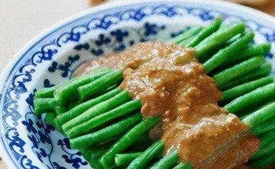 材料:豇豆、蒜泥、香油、花椒油、芝麻醬、鹽、味精。