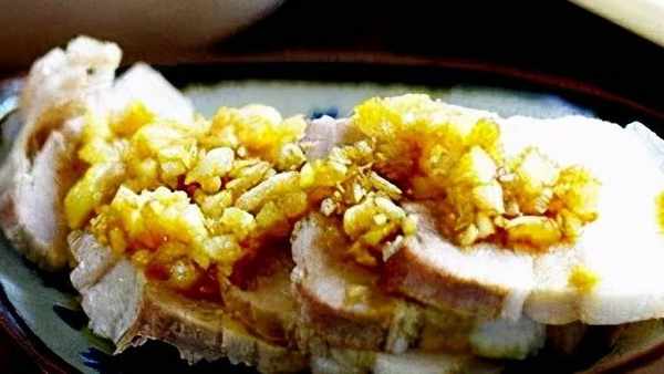 材料:薑片、蔥段、豬後腿肉、大蒜、白糖、醬油、鹽、香醋、味精、辣椒油。