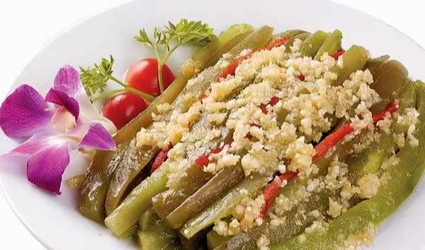 2.將大蒜去皮洗凈,放入鹽,搗成蒜泥,拌入醬油,香醋,味精,辣椒油調成味汁,淋在味汁即成。