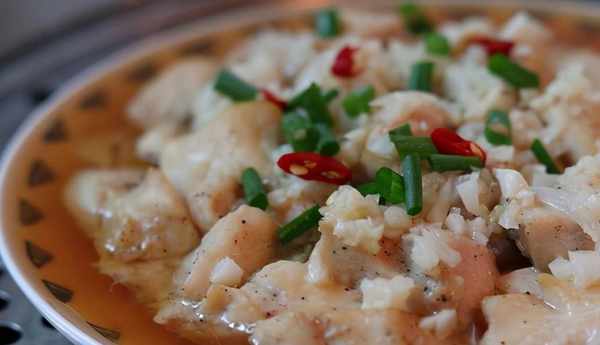 2.將蒜蓉、味精水、香油、鹽調勻,淋於雞肉上,撒上蔥花即可。