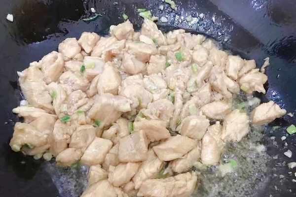 6、加入醃制好的雞胸肉,轉中大火,直到翻炒至雞丁變色即可。