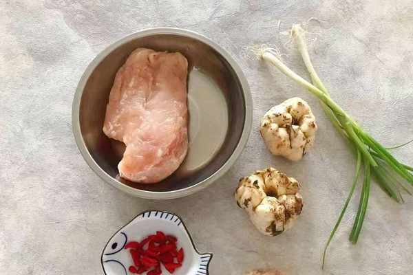 1、首先準備好要用的全部食材,網購來額新鮮百合兩個,一塊的雞胸肉和少許的枸杞。