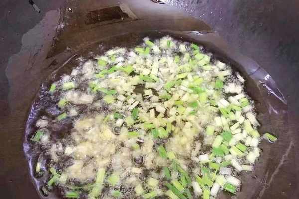 5、起鍋燒油,油熱字後將蔥白的部分放入鍋中煸炒均勻,直到炒出香味就可以瞭。