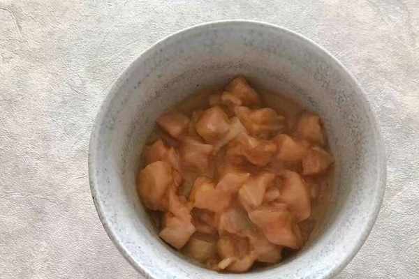 2、將一塊雞胸肉切成小丁之後加入適量料酒,生抽,淀粉,細砂糖,麻油,抓拌均勻之後,醃制15分鐘,備用