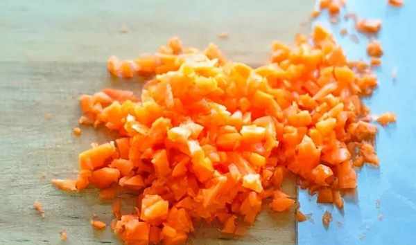 4.胡蘿卜半根同樣將其切成細絲,然後再切丁放入碗中備用。紅薯葉已經浸泡好啦,然後用手攥幹裡面的水分。再用刀剁成小塊,放入碗中備用。