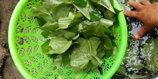 1.首先準備一小把新鮮的紅薯葉,將其放在清水中給它清洗幹凈。這個時候的紅薯葉基本上都不打農藥的,但是表面有很多的灰塵和雜質。所以大傢一定要記得用清水給它仔細清洗幾遍。這樣在吃的時候就不會有牙磣感覺啦。