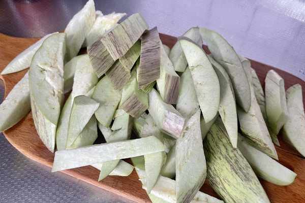 1.茄子先切成厚片,再切成茄子條,想快點熟可以切細一點,但是沒有粗條口感好。
