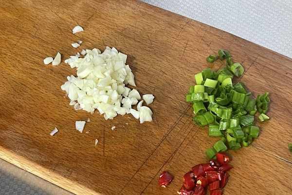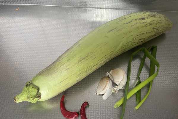 所需食材:茄子一根,蒜兩瓣,小蔥半根,生抽一勺,蠔油一勺,鹽少許,食用油一勺,雞精少許,小米辣適量。