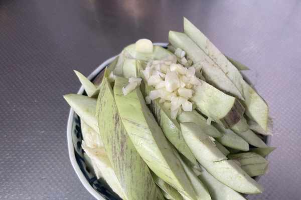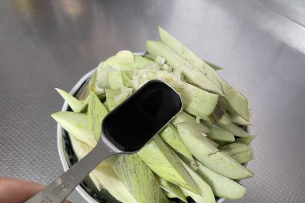 3.把茄子條放大碗中,加入一半蒜末,剩下一半蒜末等出鍋後再放。