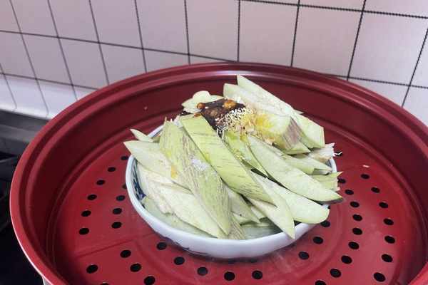 5.鍋中加入足夠清水,把茄子碗放入蒸屜上,蓋上鍋蓋,大火加熱,水沸騰後,轉小火蒸15分鐘左右,茄子變軟就行。具體時間要根據茄子多少和粗細程度決定。