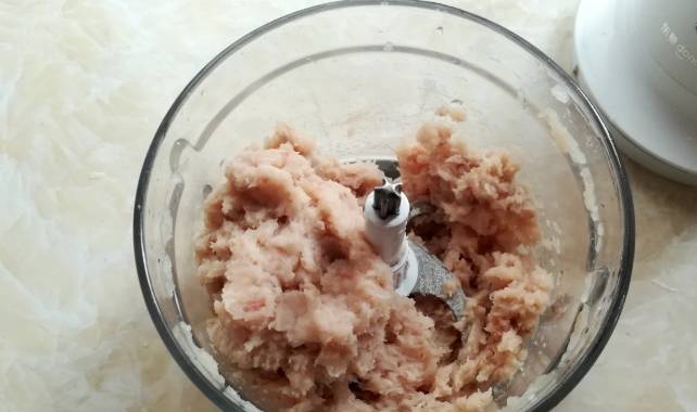4、剔下來的魚肉放入料理機中,分四次打成魚肉泥,打魚泥的時候大傢可以利用這個時間將鍋中添加適量的水燒開。