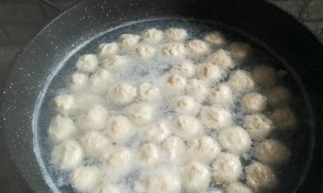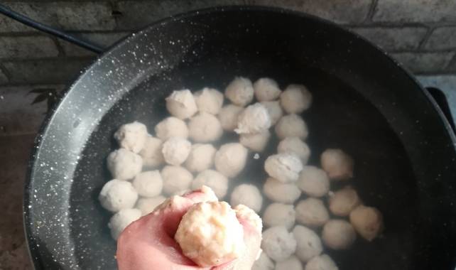 8、用左手抓取適量的魚肉泥,從虎口位置擠出,用勺子把魚丸刮到熱水裡。