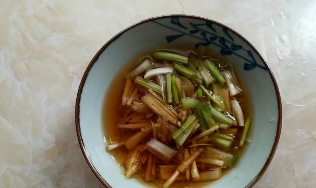 3、將一小塊生薑洗幹凈去皮切成薑絲然後放入碗中,加入蔥白段,加入一勺料酒之後混合在一起備用。